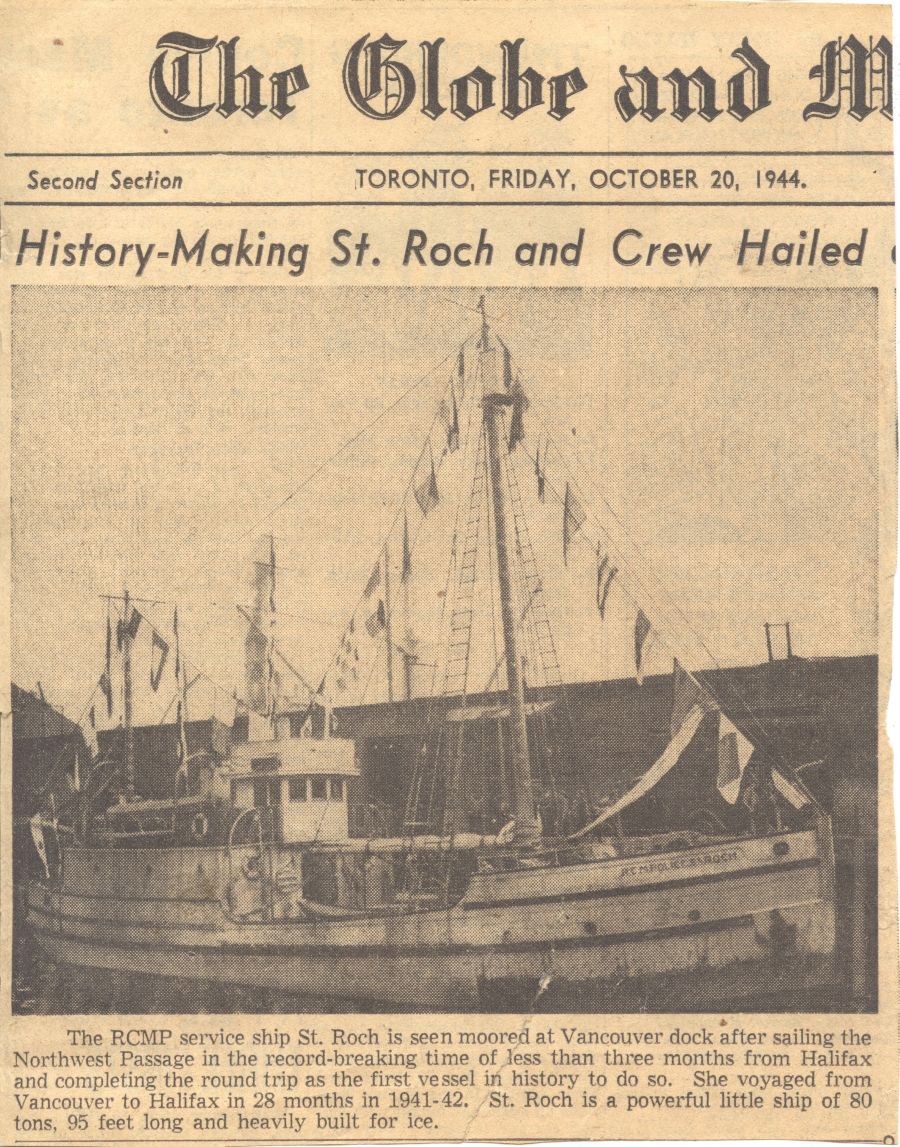 Article on St. Roch transiting the North West Passage in under 3 months // The Globe and Mail 20 Oct 1944 From the collection of Ross (Sandy) Somerville, Leading Coder, RCNVR