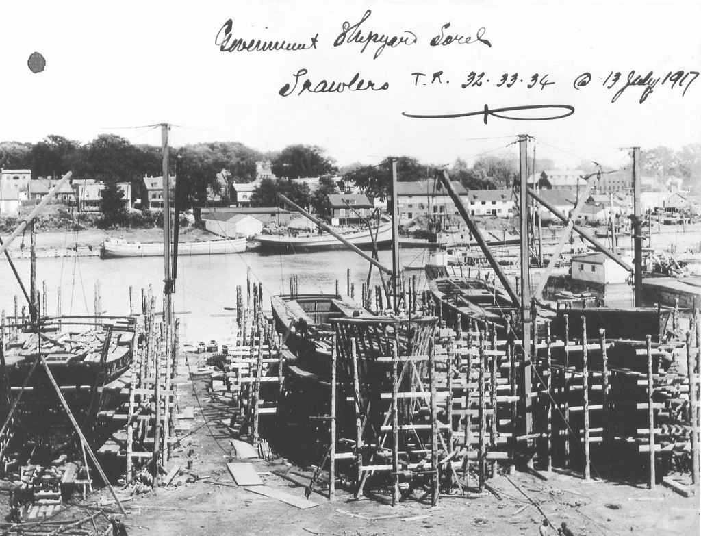 Trawlers TR32, 33 and 34 under construction at the Government Shipyard, Sorel, Quebec 13 Jul 1917