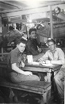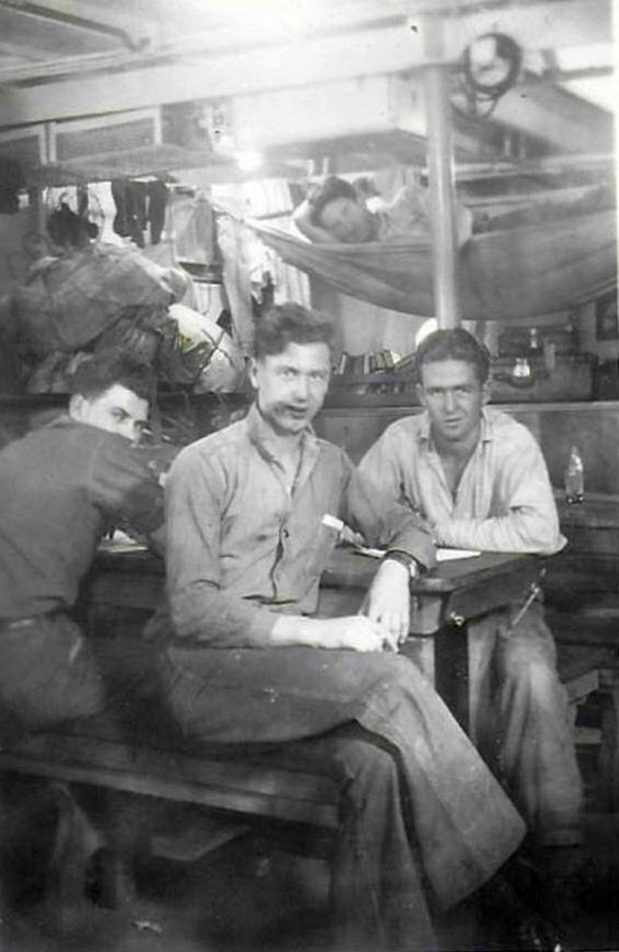 (JA13) Mess deck on HMCS ALBERTON. Jack sitting in the centre (JA14) Mess deck on HMCS ALBERTON. Dinny in Hammock, Frank (rear, center), Woody (right) (JA15) Mess deck on HMCS ALBERTON. Dinny in Hammock, Wood (right), Jack (centre). I (Jack) was his best man at Woody's wedding in Toronto. It was a Syrian wedding that went on for days! (JA16) Unknown sailor up the mast on HMCS ALBERTON (JA17) Ships alongside seen from HMCS ALBERTON. HMCS SAULT STE MARIE J334 in the upper left corner of the photo