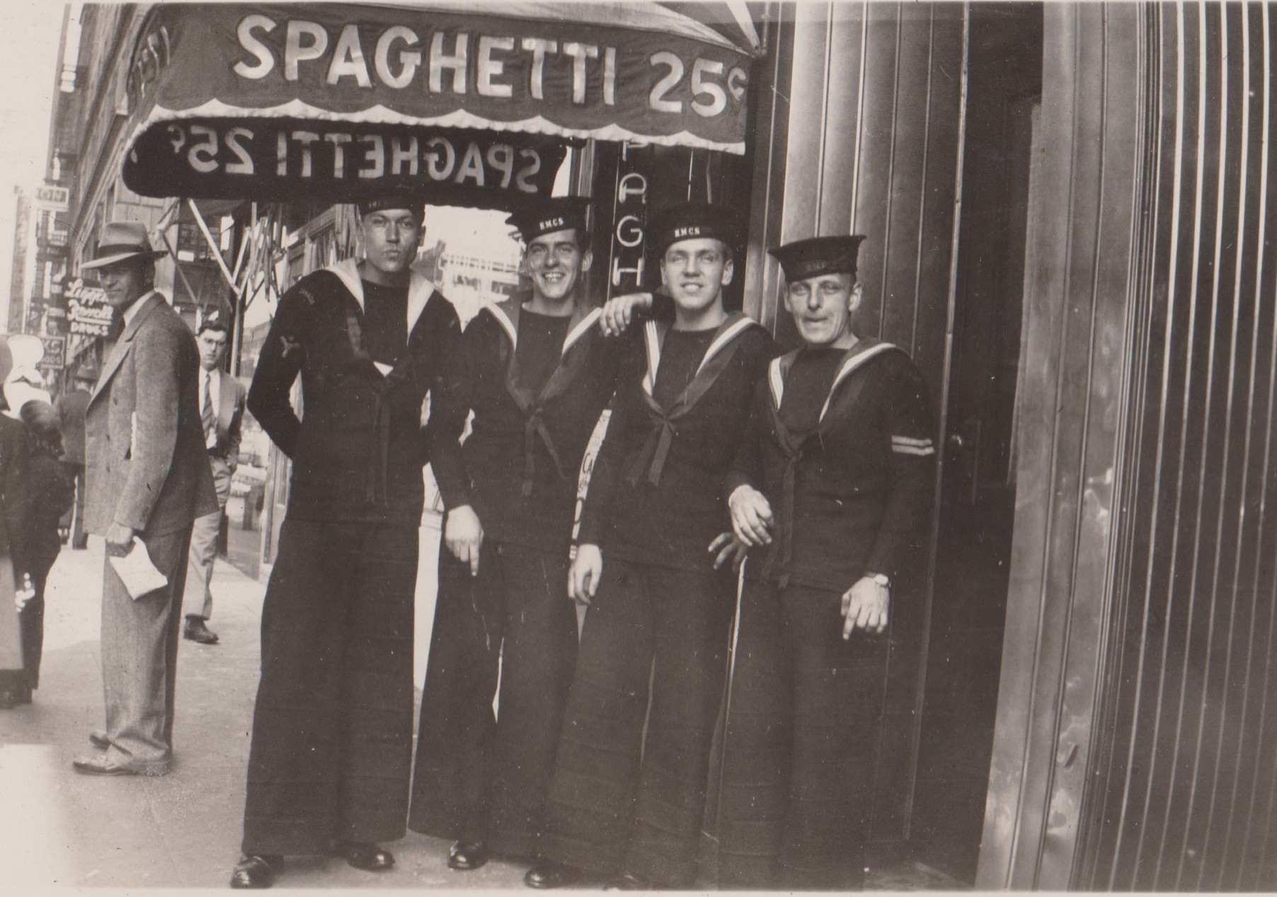 Towers, Martin, Hughs and Romson ashore in front of a restaurant advertising Spaghetti 25¢ Photo believed to be taken in New York City From the collection of John (Jack) Gilbrook, Stoker, RCN