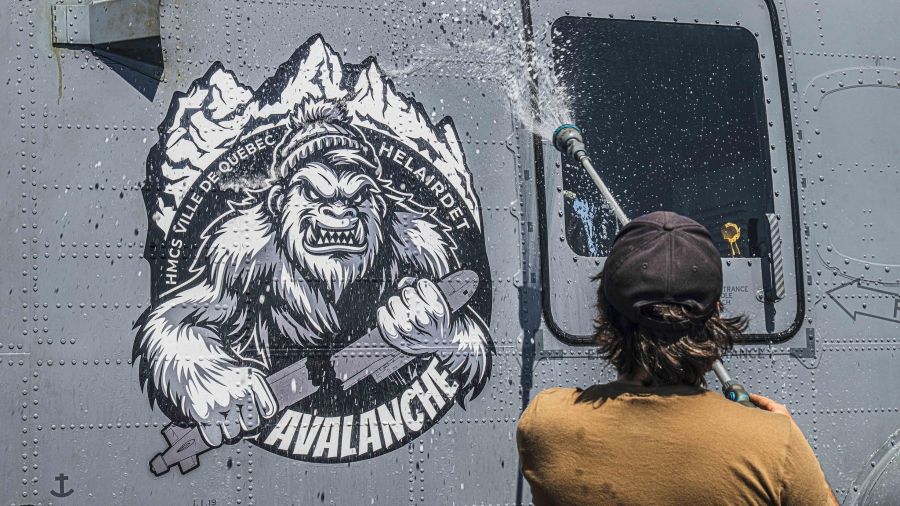 Andrew Brandt sprays the side CH-148 Cyclone helicopter, Avalanche, for a