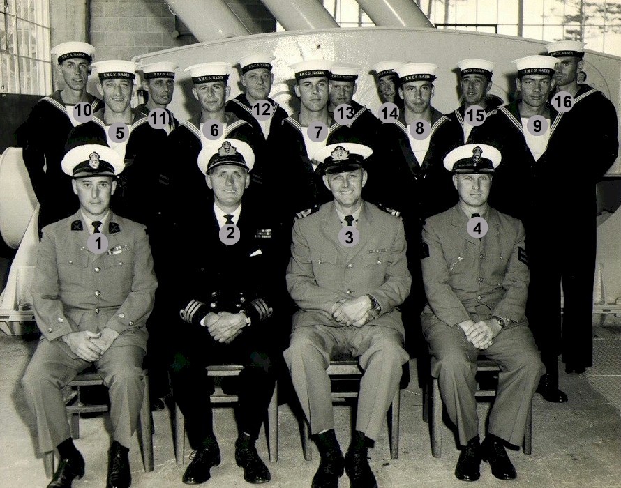 (1) Theriault, Bob, PO1 (2) Rowley, Al, Lt (3) Bonner, Al, LCdr (4) Drummond, C2 (5) Holman (6) Leach (7) Featherby (8) Rivest (missing Wiege)