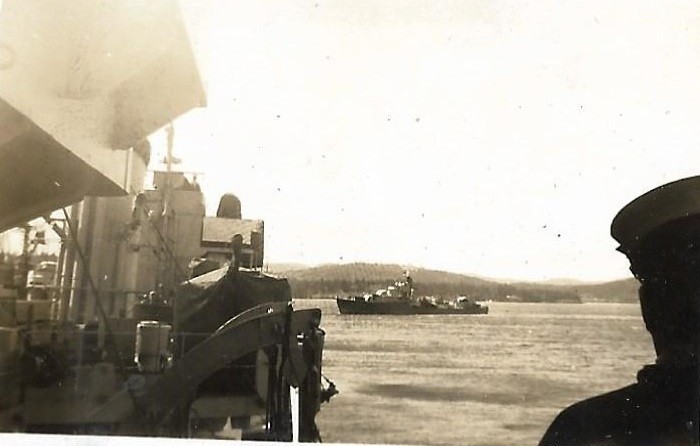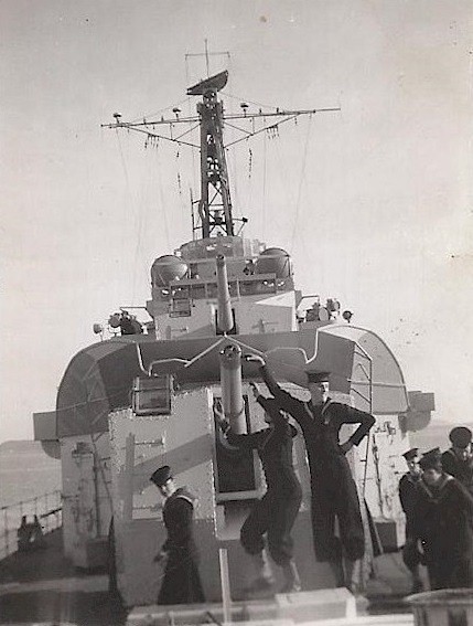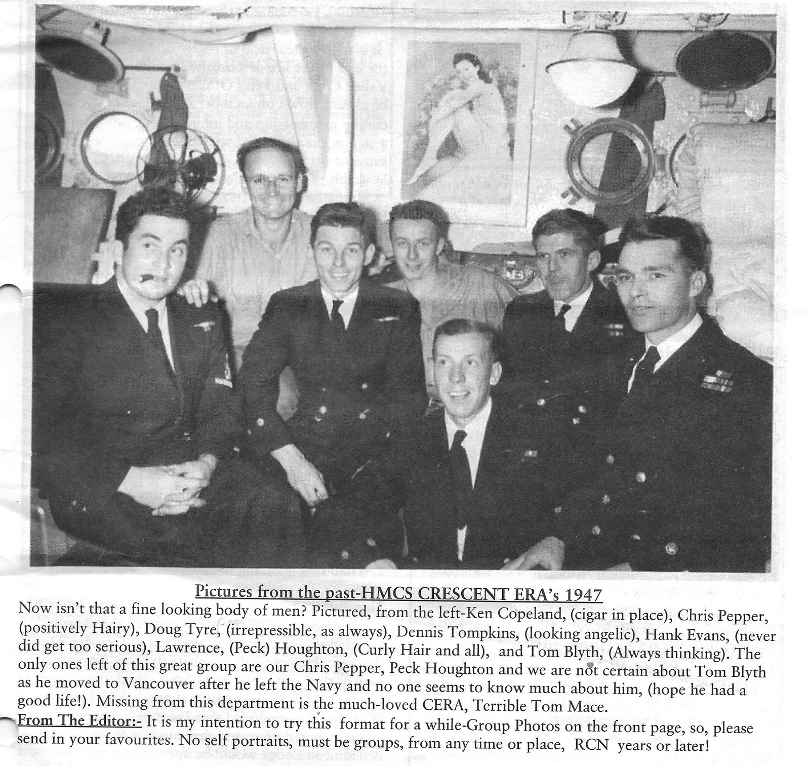 (CRS005) Cadets Robert Rice (left) and Jack Cummer (right) on the twin bofors on HMCS CRESCENT, 03 Sep 1946 // From the collection of Robert Rice // Courtesy of J.D. Ford (CRS006) Cadet Robert Rice leaning on the gun barrel on HMCS CRESCENT, 03 Sep 1946 // From the collection of Robert Rice // Courtesy of J.D. Ford (CRS007) HMCS UGANDA joins HMCS WARRIOR and HMCS CRESCENT of Acapulco Bay // Halifax Mail, Wed. 27 Nov 1946 // Courtesy of George Newbury (CRS008) ERAs on HMCS CRESCENT 1947 // Ken Copeland, Chris Pepper, Doug Tyre, Dennis Tompkins, Hank Evans, Lawrence (Peck) Houghton, Tom Blyth // Source: Chief and POs Association, Esquimalt newsletter // Courtesy of Steve Hlasny (CRS009) HMCS CRESCENT - 1948 // From the collection of Tom Smith, C2ET, RCN