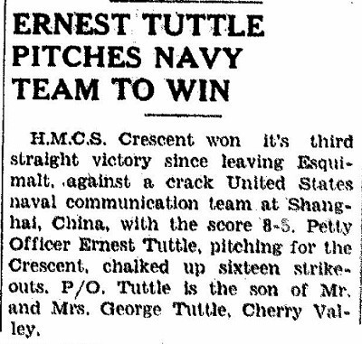 (CRS010) HMCS CRESCENT Fastball Champions 1948, West Indies // From the collection of Richard (Dick) James, CPO1 GI, RCN // Courtesy of Rick James (CRS011) P.O.s Boats Crew HMCS CRESCENT - 1948, West Indies // Dick James - Hank Bennetts - Bob Clements - Ned Kruncki - Harry Brown - "Popeye" Chambers (Cox) // From the collection of Richard (Dick) James, CPO1 GI, RCN // Courtesy of Rick James (CRS012) Ernest Tuttle Pitches Navy Team To Win // Newspaper article from the Picton Gazette, Mar. 16, 1949 // Source: Prince Edward County Archives Microfilm collection // Researched and complied by: © John Lyons 2016 (CRS013) HMCS CRESCENT sailors ashore - c 1948 - 1949 // L-R Bud Fell, Harry Driemel, unknown // From the collection of Harry Driemel // Courtesy of Daryl Driemel (CRS014) It is not known if this photo is HMCS CRESCENT or HMCS Crusader - circa 1950 // From the collection of William C. Dziadyk // Courtesy of Bill Dziadyk