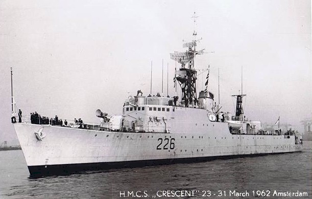 CRESCENT carried out training duties until taken in hand for a major conversion in 1953. She emerged in 1956 as a "fast A/S frigate," following an RN pattern which entailed stripping her to deck level, extending the fo'c's'le right aft, erecting new superstructure, and fitting completely new armament. She was now a near-sister to Algonquin, which had undergone similar transformation earlier. On 15 Jan 1958 HMCS CAYUGA 218, HMCS CRESCENT 226, HMCS FRASER 233, HMCS MARGAREE 230, HMCS SKEENA 207 departed Esquimalt, BC, for a Far Eastern Training cruise. In Feb 1959, HMCS CRESCENT and HMCS ASSINIBOINE met at San Diego and exchanged crews. CRESCENT was paid off at Esquimalt on 01 Apr 1970. She left Victoria with ALGONQUIN on 21 Apr 1971, for Taiwan, to be broken up. She arrived at Taiwan on 15 May 1971.