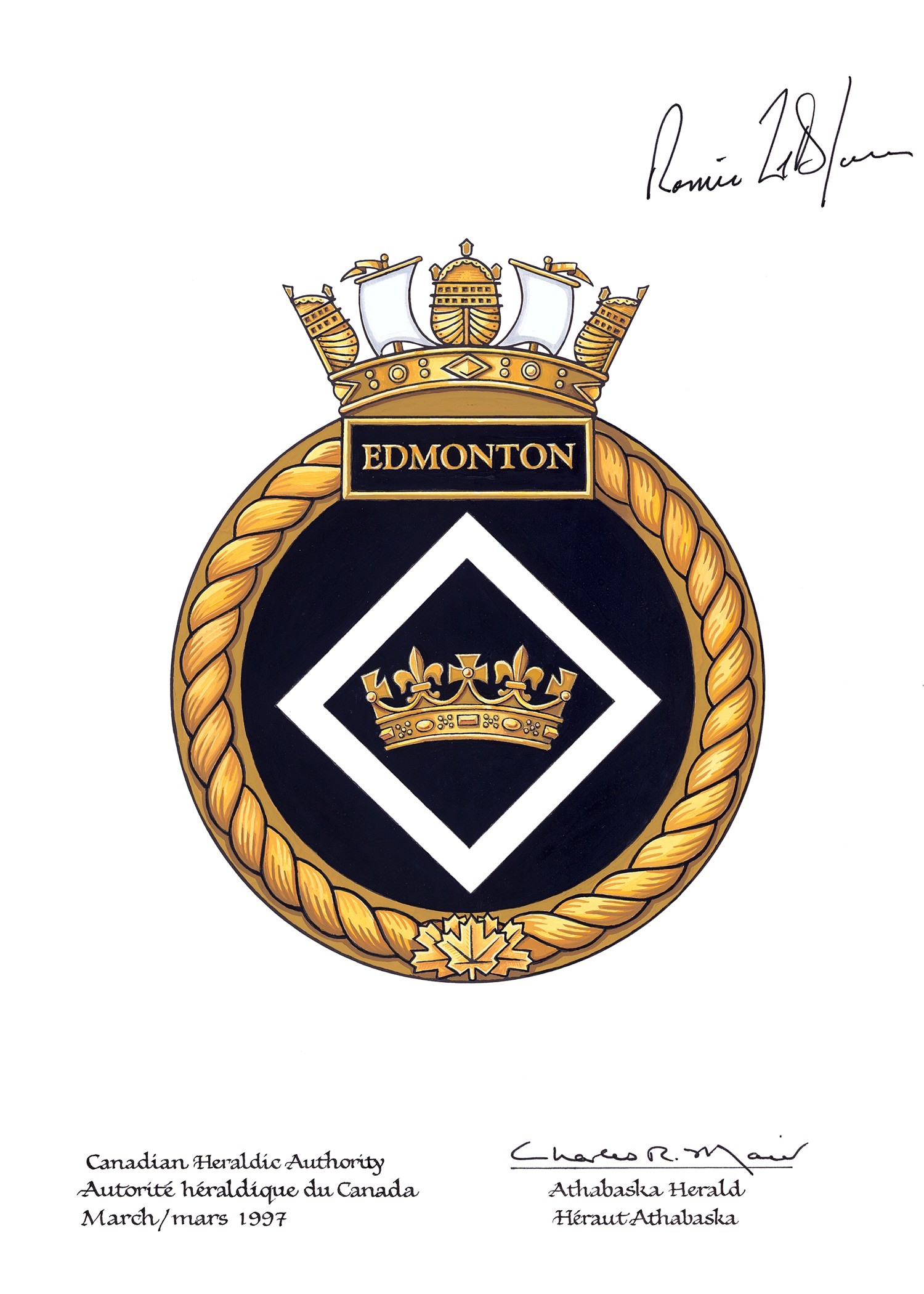 (EDM001) HMCS EDMONTON'S official badge (EDM002 - EDM004) HMCS EDMONTON entering Esquimalt harbour for the 1st time // DND-RCN photos