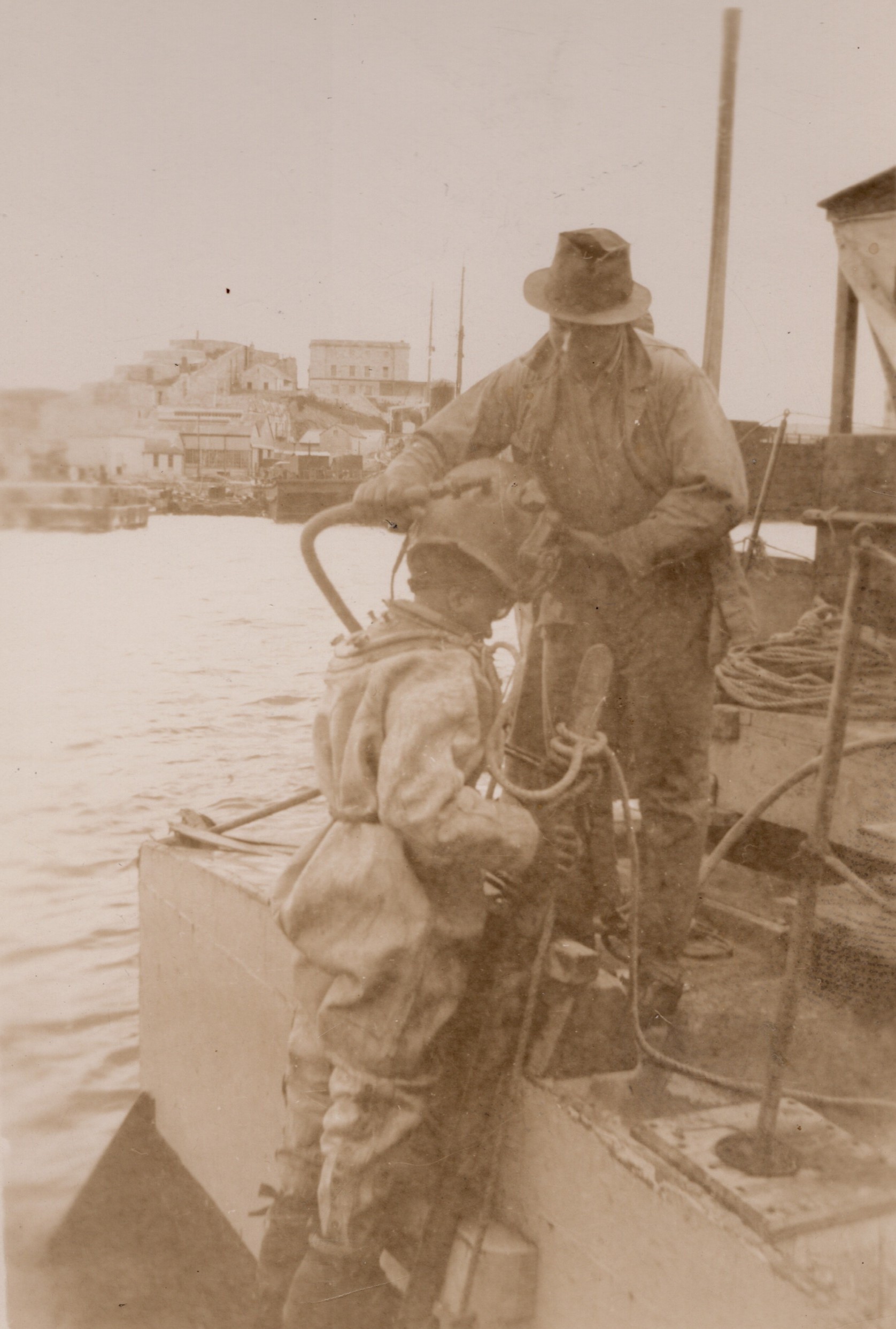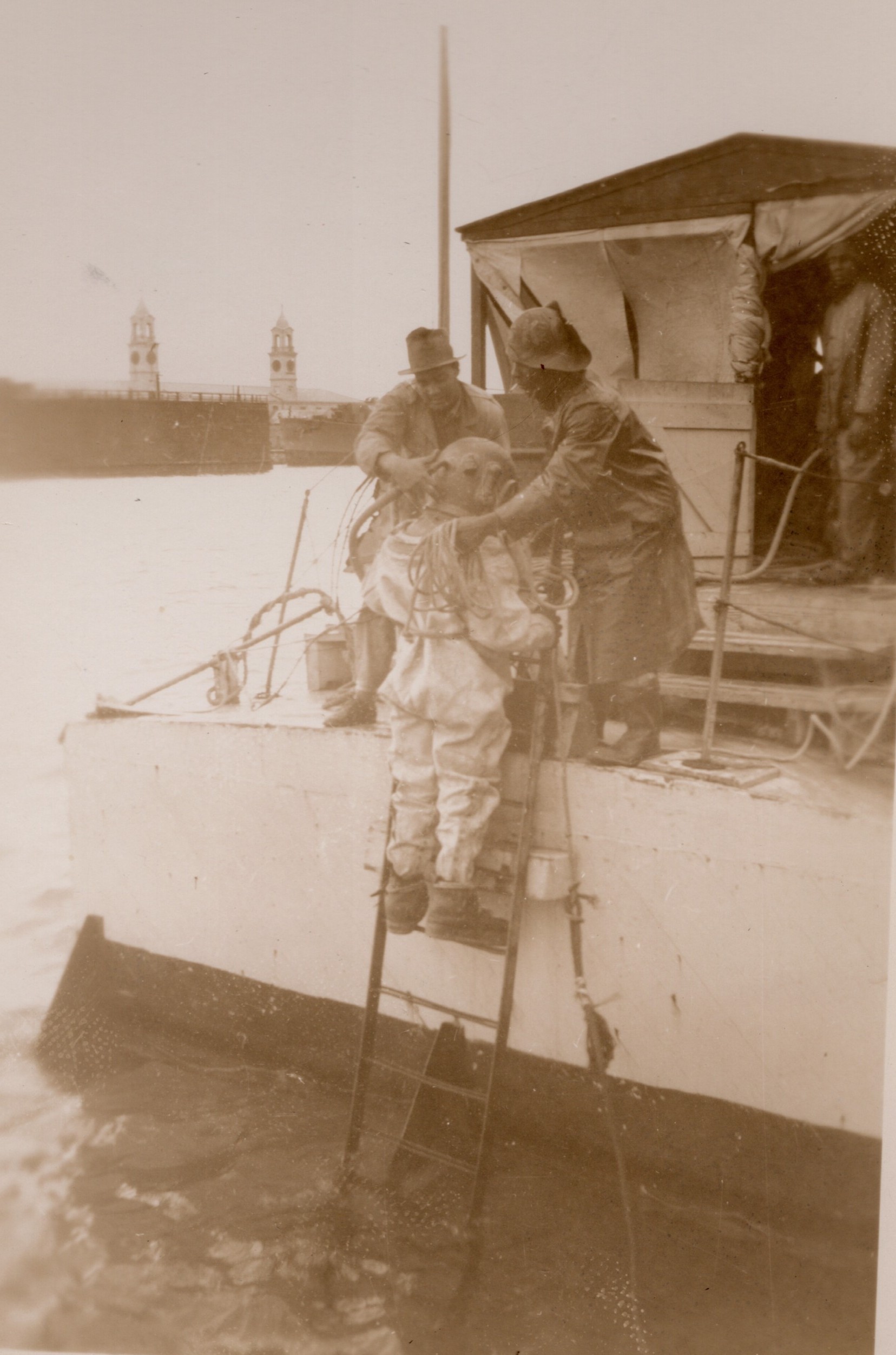 (NFA077) HMCS NEW GLASGOW K320 - undated (NFA078 - NFA079) Hard hat diver coming out of the water, Bermuda - undated