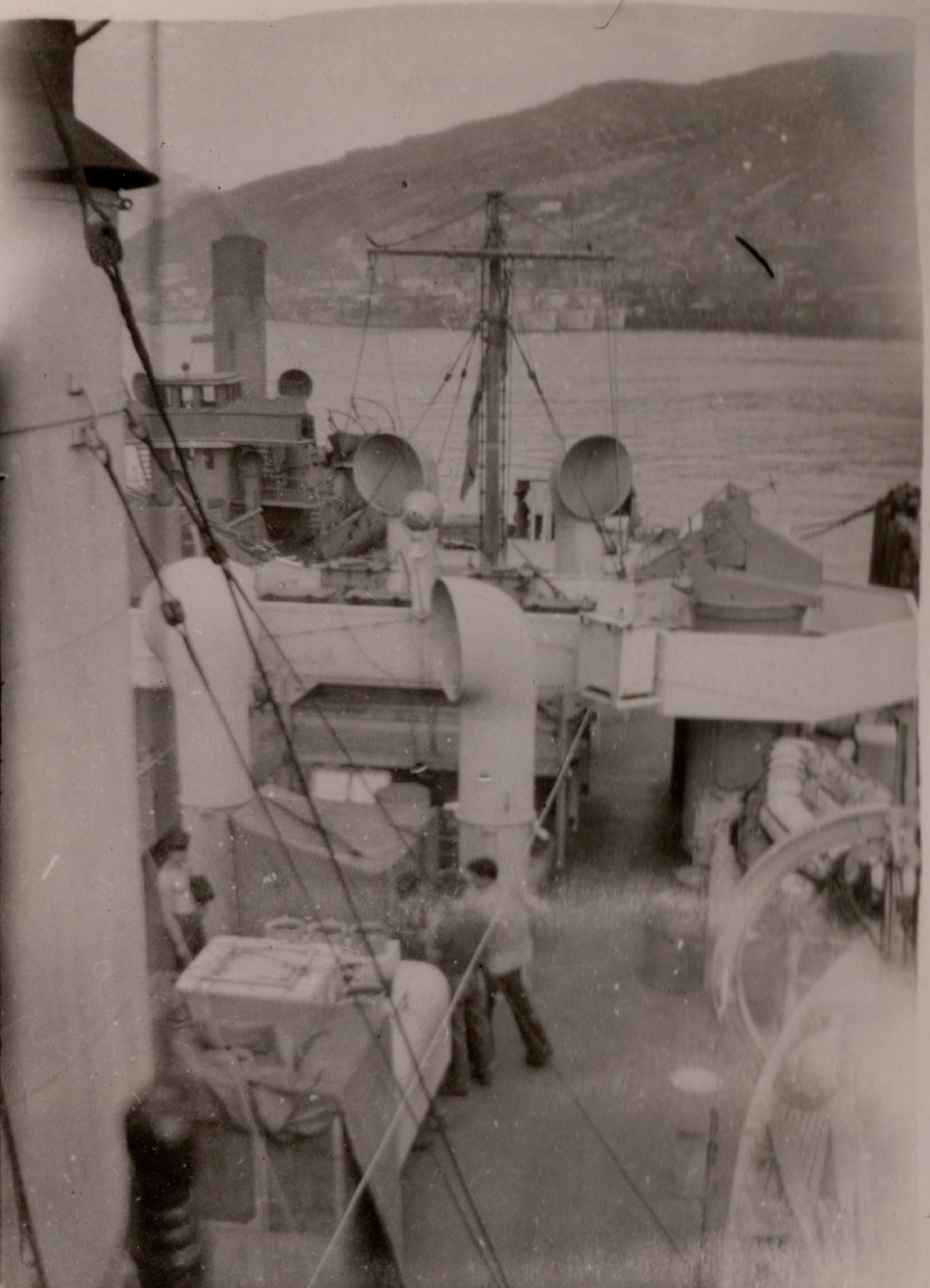 (NFA006) A/LCdr Hanbury (the Jimmy) and LCdr Hall (Old Man) [on HMCS NEW GLASGOW K320 en route to Halifax from the west coast - 1944 // back of photo. Note: The New Glasgow arrived in Halifax on 17 Feb 1944. (NFA007) HMCS NEW GLASGOW K320 off Halifax, NS - Feb 1944 (NFA008) "Chippy" on HMCS NEW GLASGOW K320 off Halifax, NS