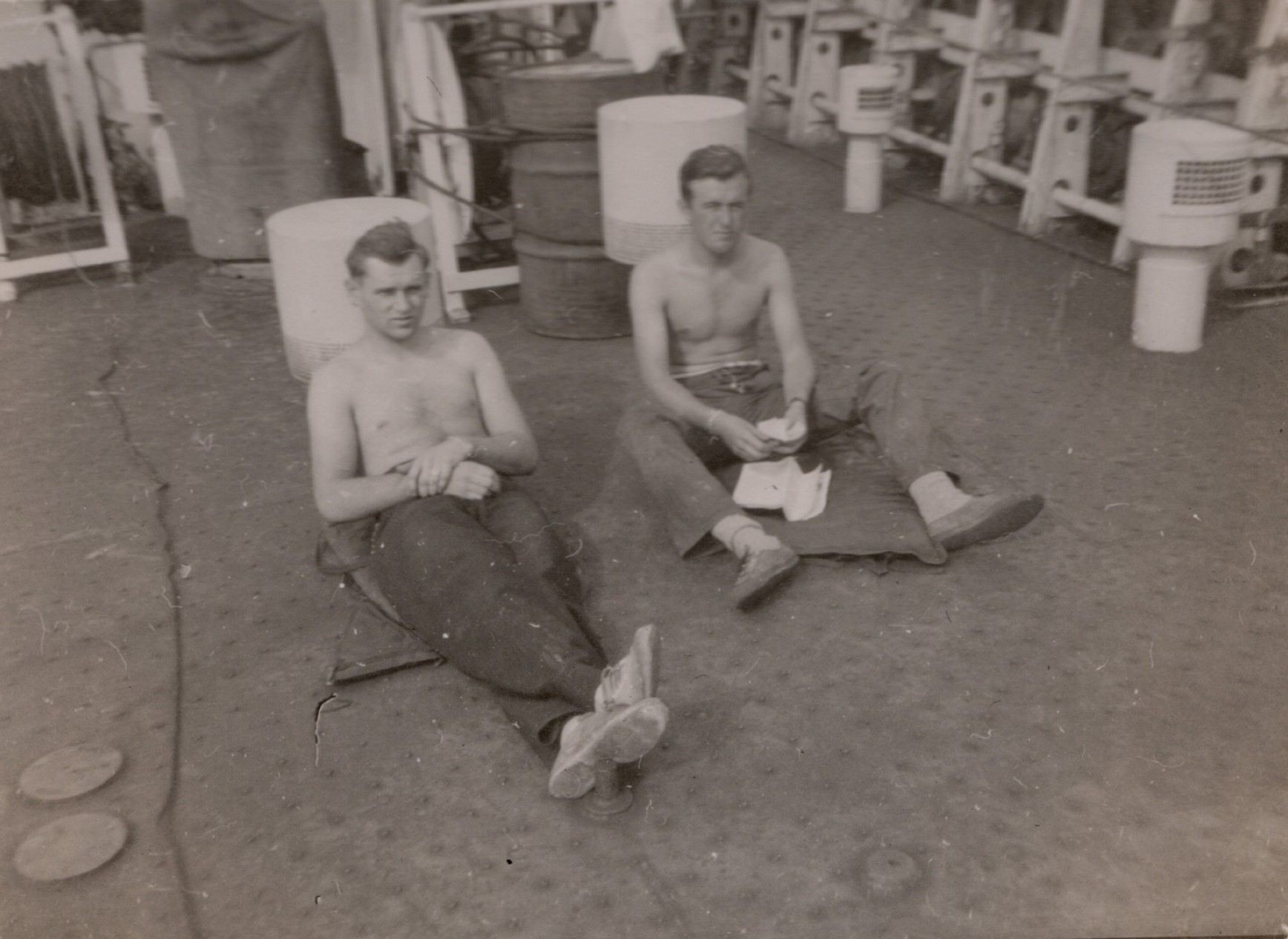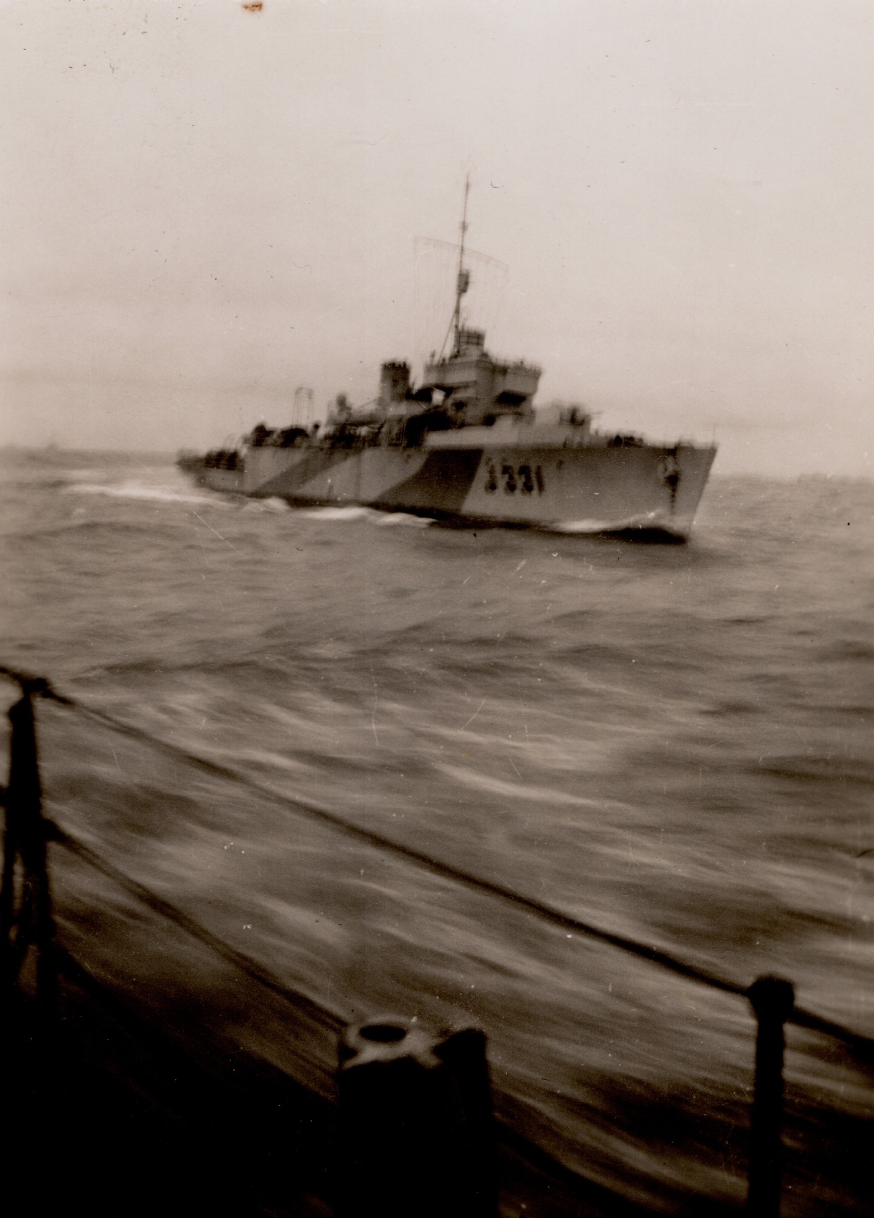 (NFA014) Newfie bound Halifax Convoy - May 1944 (NFA015) J. May on lookout duty on HMCS NEW GLASGOW K320 while in convoy - May 1944 (NFA016) Signalman Norman Ayre (left) and Telegraphist John Schenk off Ireland on HMCS NEW GLASGOW K320 - May 1944 (NFA017) HMCS NEW GLASGOW K320'S boat's crew going for patient - May 1944 (NFA018) HMCS NEW GLASGOW K320'S boat's crew returning with patient from HMCS GIFFARD K402