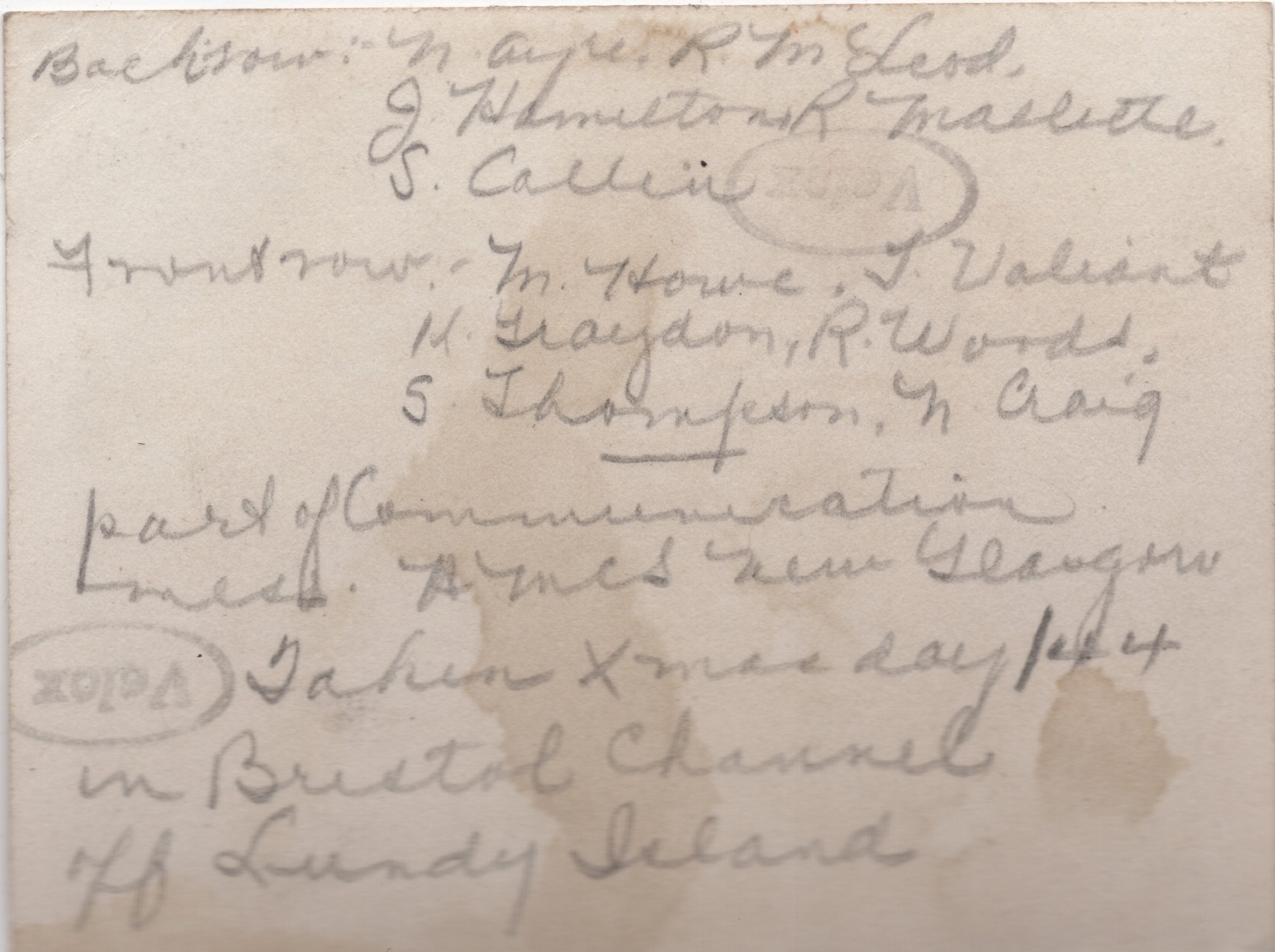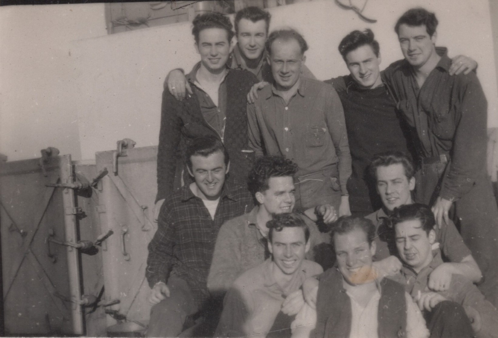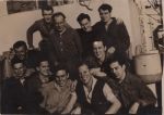 (NFA103) Part of Communications mess, HMCS NEW GLASGOW K320. Taken X-mas day 1944 in the Bristol Channel off Lundy Island // Back row: Signalman Norman Ayre; Coder Ross McLeod; Signalman Harvey Hamilton; Telegraphist Ray Malliette; Signalman Sid Collin // Front row: Telegraphist M. Howe; T. Valiant; Telegraphist (H/F D/F Operator) Ken Graydon; Signalman Reg Woods; Leading Coder Stan Thompson; Telegraphist Norman Craig // Back of photo (NFA104) Party of Communications mess, HMCS NEW GLASGOW K320. taken X-mas day 1944 in the Bristol Channel off Lundy Island (NFA105) HMS RAMILLIES, Portsmouth, England - Feb 1945 (NFA106) Sig Norman Ayres on HMCS NEW GLASGOW K320. The ship is at anchor off Larne, Northern Ireland during "WUPS" (Work Ups) - Feb 1945 (NFA107) Telegraphist Mprris Howe (left) and Signalman Norman Ayre on HMCS NEW GLASGOW K320 at sea - Feb 1945