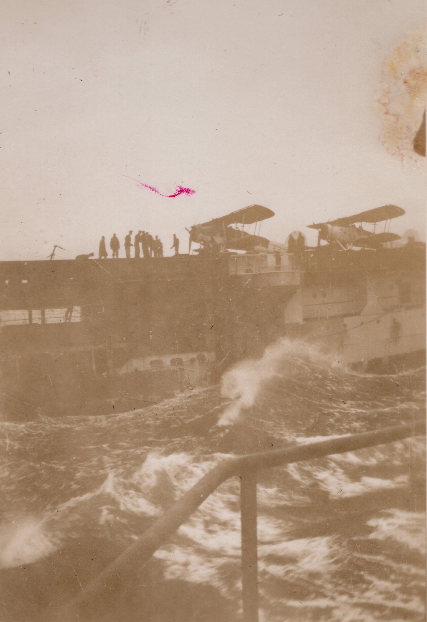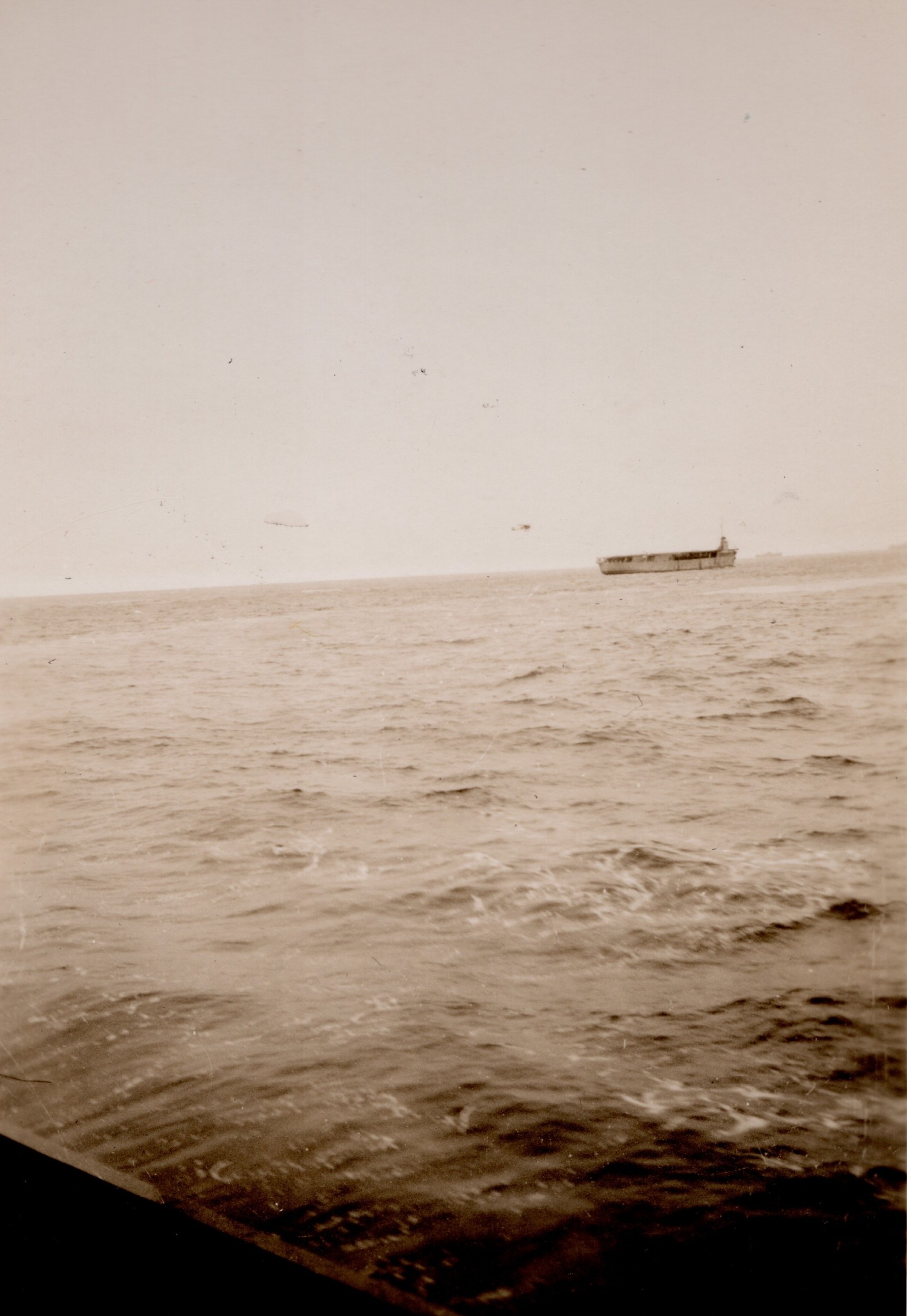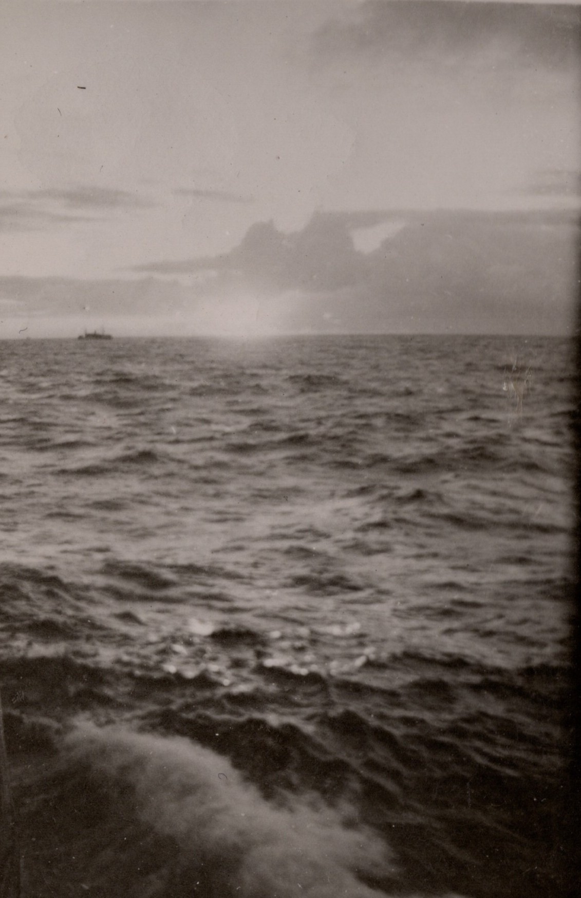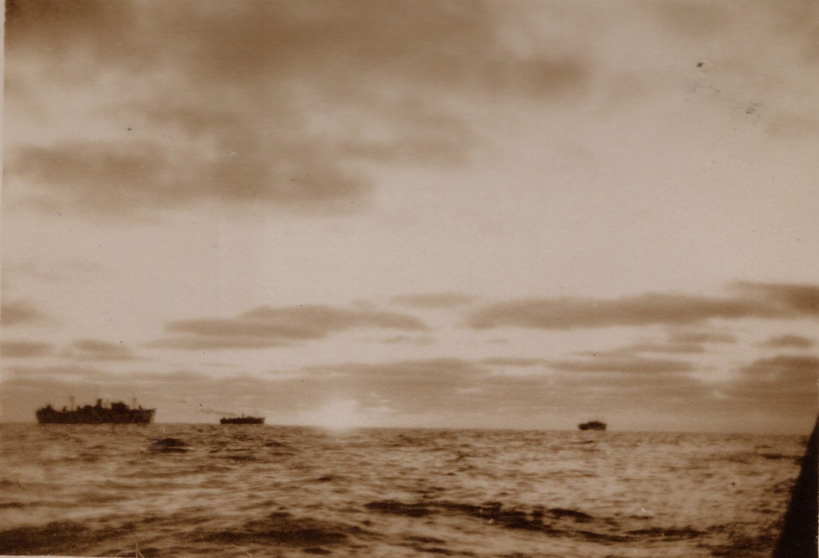 (NFA062 - NFA063) Depth charges exploding astern of HMCS NEW GLASGOW K320 - undated (NFA064) USN Landing craft tank off Chebogue, France - undated (NFA065) Sunrise on a North Atlantic convoy - undated (NRA066) Unknown Merchant Aircraft Carrier with Swordfish ranged on deck at sea near HMCS NEW GLASGOW K320 - undated
