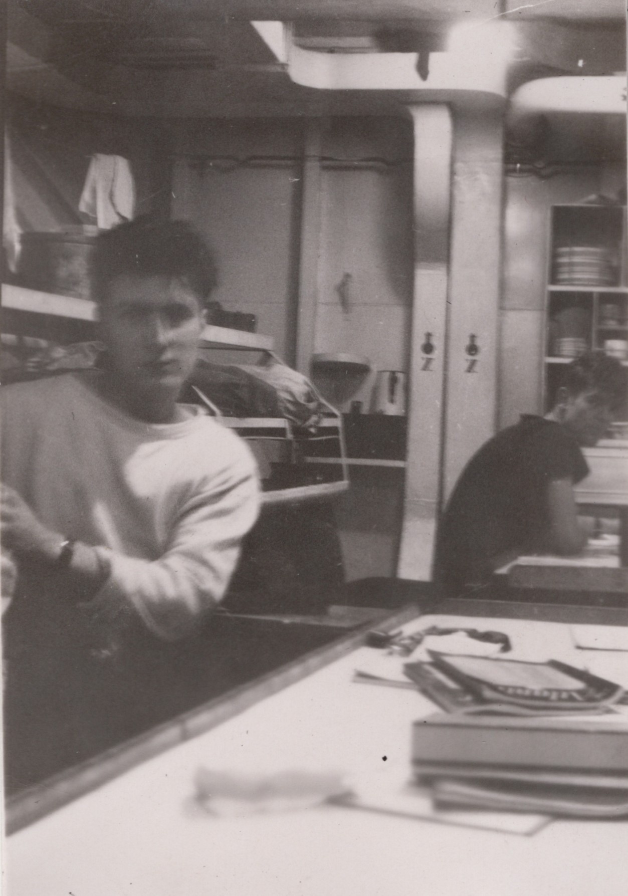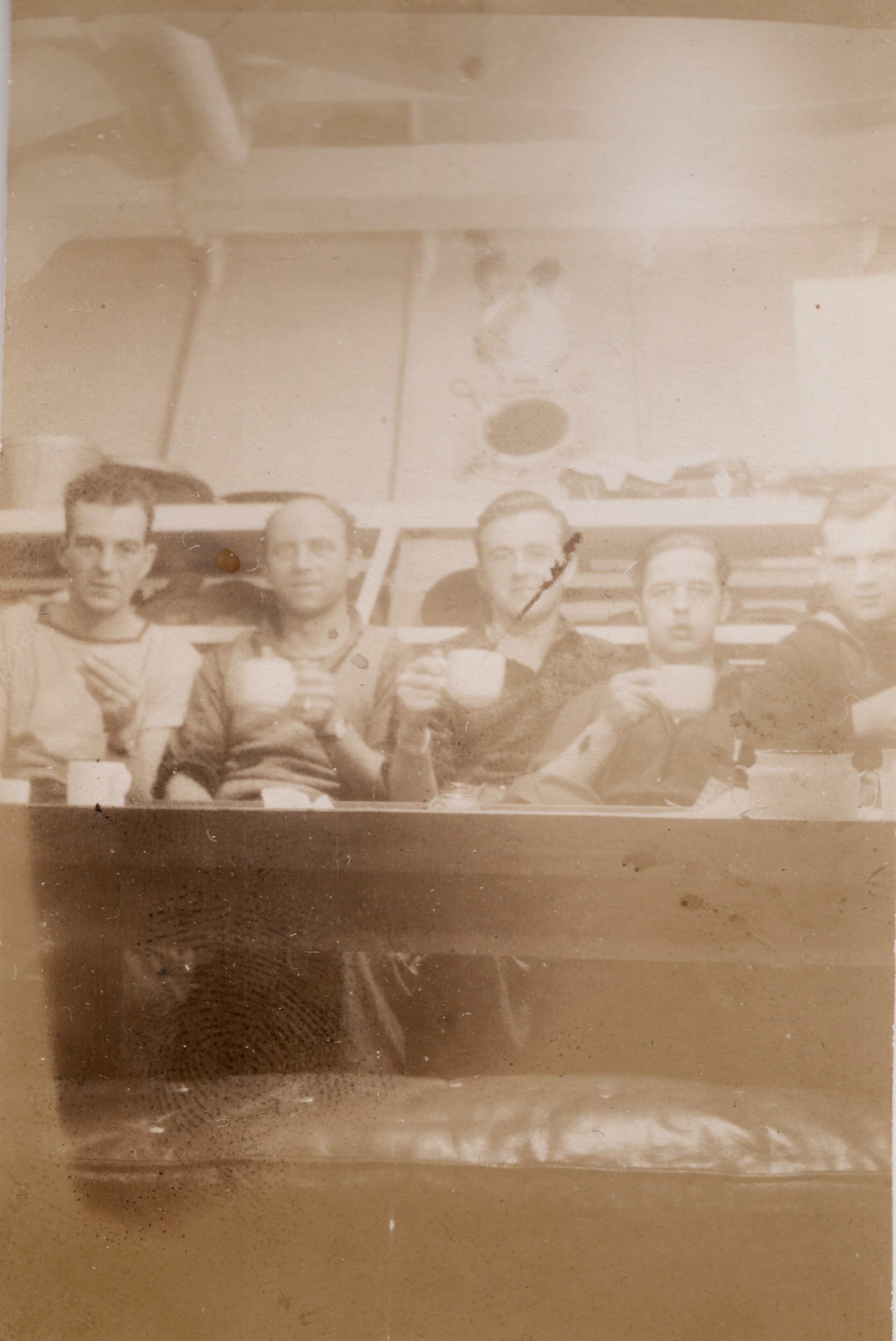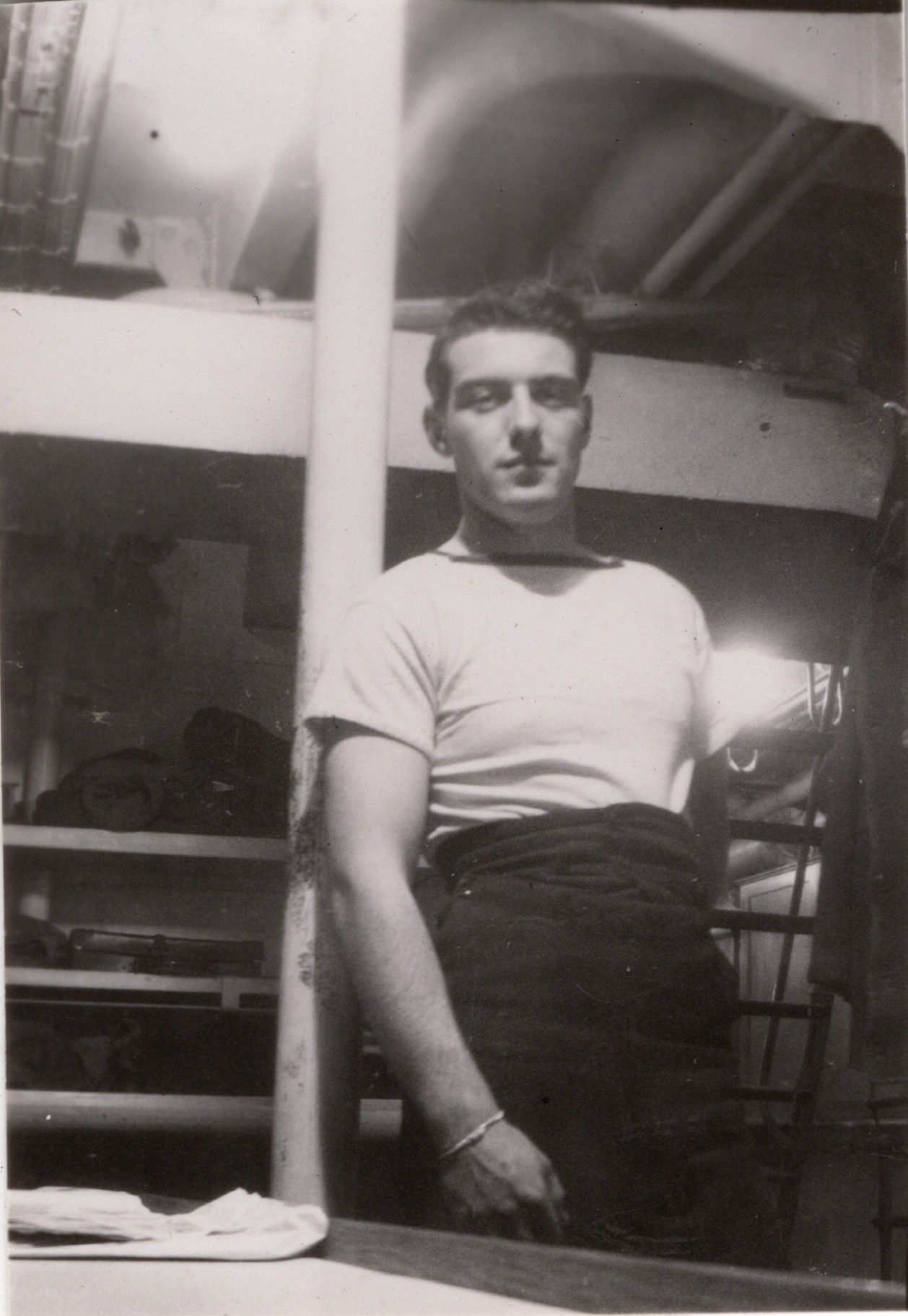 (NFA047) Communicator's mess deck on HMCS NEW GLASGOW K320. Signalman Norman Ayres (left) and Telegraphist John Schenk - undated (NFA048) Coffee time in the Communicator's Mess Deck - Stoker Petty Officer Comber, Stoker Petty Officer MacLardy, Signalman Norman Ayre, Telegraphist Norman Craig, Telegraphist John Schenk - undated (NFA049) Signalman Sid Callin of Kirkland Lake, Ontario in the Communicator's Mess Deck on HMCS NEW GLASGOW K320 - undated (NFA050) Telegraphist Ray Mallett and Coder Ron Remey in the Communicator's Mess Deck on HMCS NEW GLASGOW K320 - undated (NFA051) Signalman Norman Ayre and shipmates ashore in an unknown location - undated