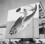(HST027) Gunshield art on HMCS NEW WESTMINSTER K228 - 06 Jan 1944 (HST028 - HST030) HMCS NEW WESTMINSTER K228 (foreground) and cable ship Lord Kelvin (HST031) Gun deck and fo'c's'le of HMCS NEW WESTMINSTER K228