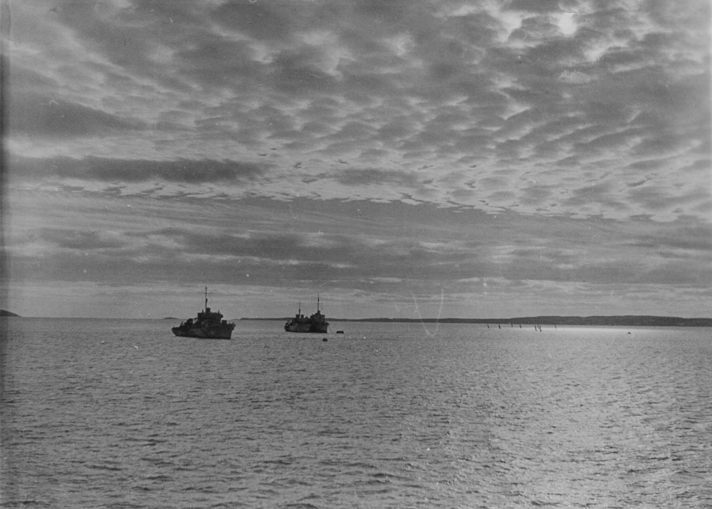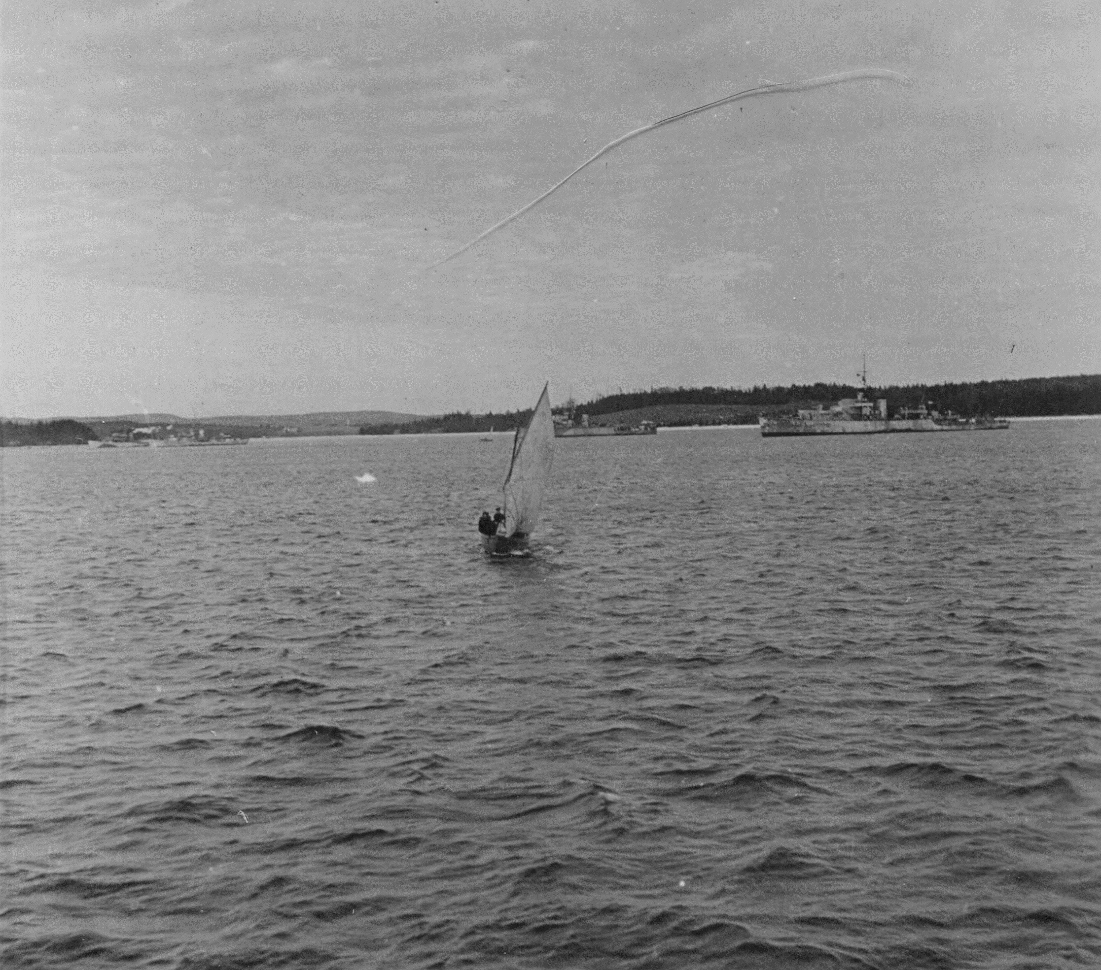 Work Ups (WUPS), St Margaret's Bay, NS - Jan 1944 (HST040 - HST041) HMCS OWEN SOUND K340 (HST043) HMCS NEW WESTMINSTER K340'S whaler under sail with a minesweeper and frigate in background (HST044) Unknown ships at anchor - 2 corvettes and a River Class destroyer