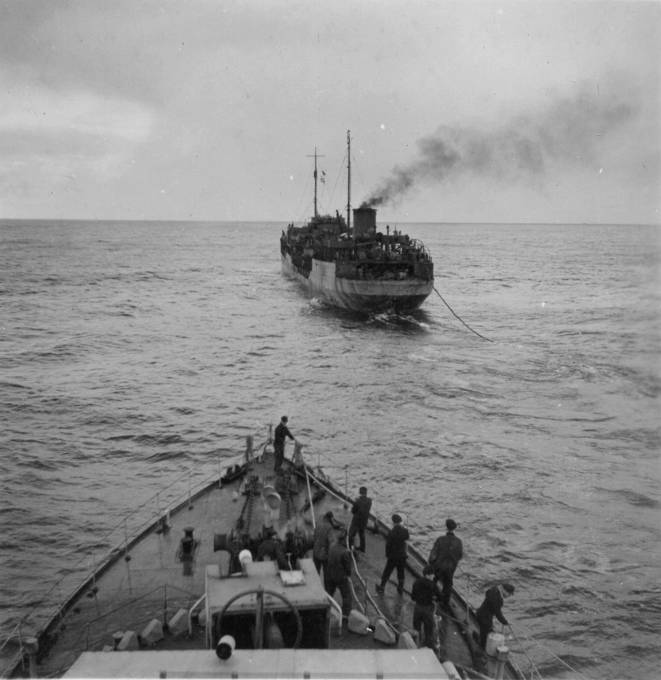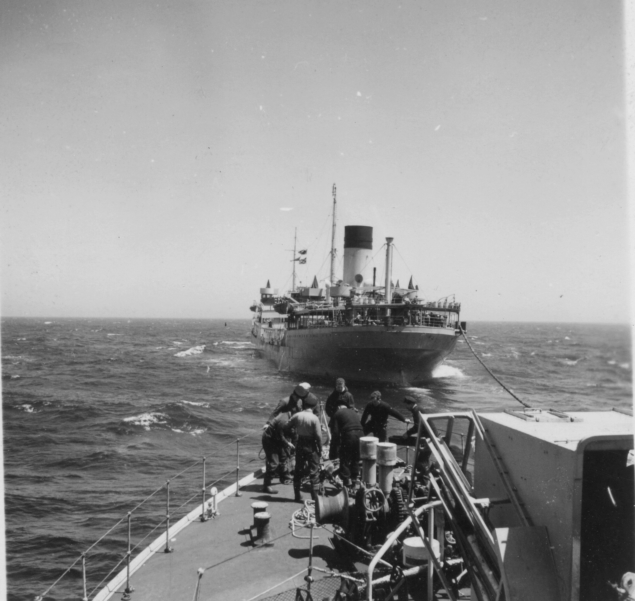 Convoy SC.153 - Halifax to Liverpool - 13 Feb 1944 - 02 Mar 1944 (HST086 - HST090) HMCS NEW WESTMINSTER K228 conducting stern fueling in convoy - Feb 1944