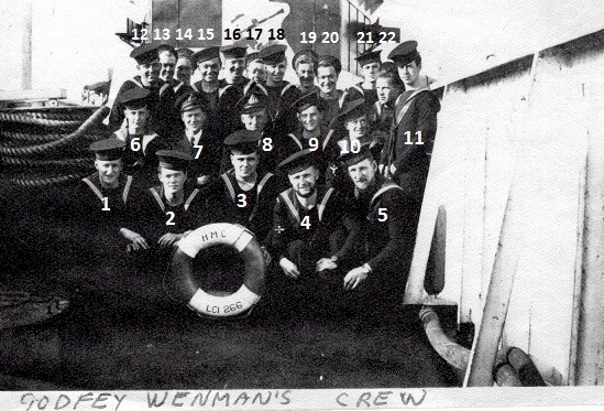 LCI(L)-266 crew photo, circa May 1944 Click on the above photo to view it without numbers (1) Clark, W. (3) Harrison, Bill (6) Rae, George R. (7) Choate, John J., Lt (8) Wenman, John Godfrey, Lt (9) Jensen, Carl (11) Winkleman, John (15) McMillan, Bob (21) Tucker, Frank Credit: Peter Ballantyne for his father, Lt William H. M. Ballantyne RCNR, CO, LCI(L)-277