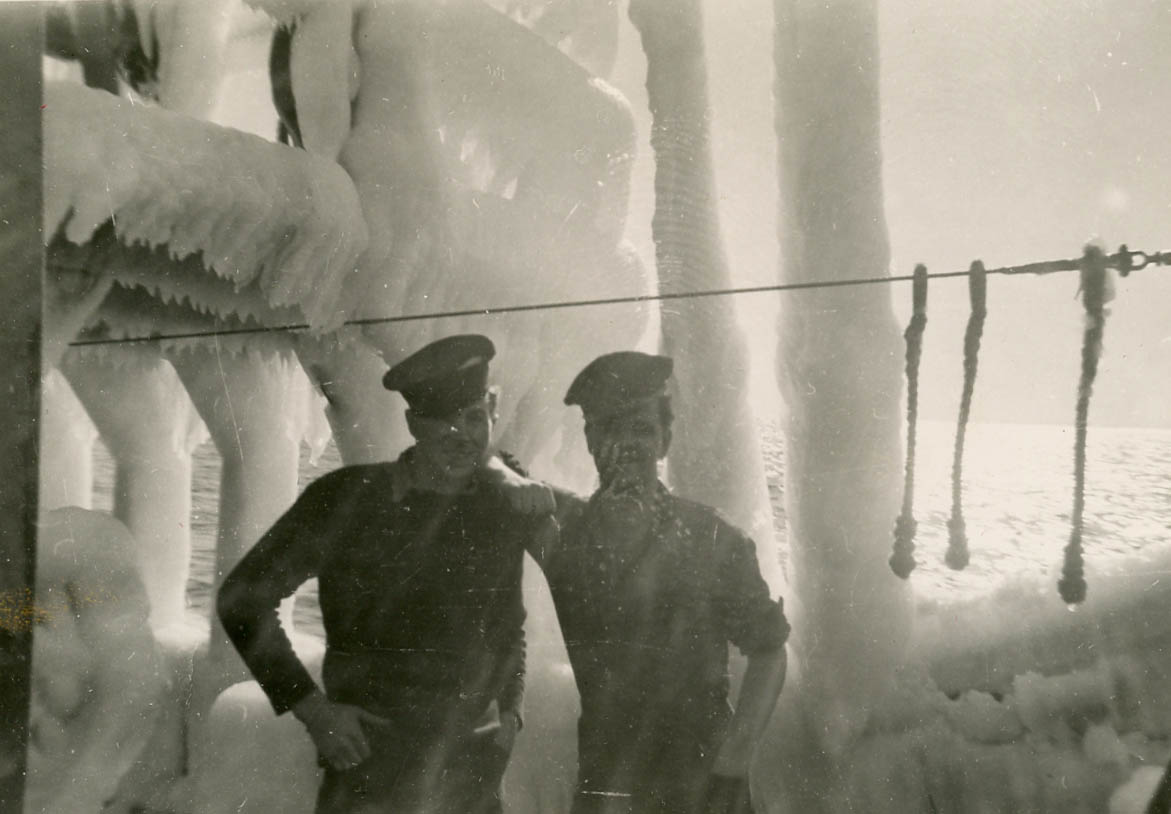 I had a friend that was in the navy. I decided, well, I’ll join the navy too. So I went into Calgary here, joined the navy and found out that he had been discharged because of his health. Well, that didn’t matter, I mean, I thought I was going to be with him but it didn’t work out that way. And then I got some training in Calgary and then went to Vancouver Island. Spent I guess about a month there. And then to Halifax. And I was only there just a short while and I was put onboard the Battleford, a corvette. I worked for Esso. The work I did was maintenance work in gas plants. So I was exposed to boilers and this sort of thing. So that seemed the natural way to go, to be with something that I understood. So stoker seemed to be the way to go. On duty, I was down in the stokehold watching the boilers and maintaining the steam pressure so that the ship could travel at whatever speeds they wanted to travel at. And other times I was in the engine room, looking after the engines. The engine, I should say. Some were on duty, some were off duty and some had just come off duty and so they were in getting some sleep. But the stokehold group were a little older than the average seaman-type guys. We were a little quieter I guess in that respect. It was crowded in the stokehold. I mean, we were right in the bow of the ship, crowded conditions, so we had to have the hammocks; you couldn’t have bunks or anything like that in there. We threw a lot of depth charges because of the sound effects that they were getting and never ever really proved that we had depth-charged a submarine or anything like that but I never saw proof that we had sunk a submarine. It was depending on the depth of the depth charge was set to explode. They could set them at 50 feet or 100 feet or 200 feet or so on and so forth. And if they set them at 50 feet, it just shook that corvette like you wouldn’t believe. And in the stokehold, it quite often broke the gauge glasses on the boilers, so we couldn’t tell how much water was in the boiler. And the only way we could tell was to go around behind the boiler and take a piece of chalk and draw a line on the back end of the boiler and the steam, it would turn brown, the water would stay white. So that was the way we could tell what we had for water in the boiler until we got the gauge glasses replaced. I was in New York when war came to an end [on May 8, 1945]. And that was really something. I mean, the people there, it was just unbelievable how they gathered and hugged you and kissed you and were so tickled that it was over and everything. And you’d go into a bar and there’d be nine people standing deep, you’d hand somebody some money and tell them what you want, they’d hand the money in and go to the bar and pretty soon there would be a drink come back. But it wasn’t what you ordered but you took it anyway. Yeah, it was really really amazing. And then we get back to Halifax and they had torn the city apart. Made an awful mess there which was really too bad. I don’t know. I’m glad I wasn’t there when they did that.