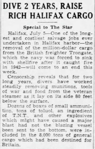 Halifax - British Salvage experts are writing the sequel to a Halifax Harbor drama of the second world War on which the Navy rang Down the curtain. It was at 1.50 on 10 April to 1942, that a naval Shell Tore through the burning holds of the explosives Laden freighter Trongate and harbour water snuffed out the towering flames that had yellowed the sky. Probably less than 15 minutes were needed to sink the 7,000-ton merchantman in la fathoms of water. Salvaging her steel plates will take three divers more than a year. In wartime the convoy with Trongate began that Spring Day 13 years ago in Bedford Basin at the North end of the Harbor where all through the War convoys were marshalled to move across the Atlantic. The freighter s holds bulged with mixed cargo ??500 tons of TNT. Several Hundred tons of Small arms ammunition Wood pulp paper and tobacco. Late in the afternoon fire flickered below decks. Who first spotted it or exactly when is not known. Neither is the cause. Wartime censorship and time itself have obscured much of the Trongate's last hours. Convoy masters decided to winch the vessel out of the crowded basin and down the harbour to the open sea ??? miles away. Shortly before 2 a.m. as the Trongate stood about midway between the Dartmouth and Halifax shorelines in the centre of the harbor flames sheeted skyward from the deck. Rifle and machine gun bullets began going off and the plates glowed against an ominous backdrop of Oil storage tanks on the Dartmouth Side. The Navy held a hurried conference with port officials. It was decided to sink the ship with gunfire before the flames ate into the volatile TNT. Two Canadian and three United states warships turned their guns on the floating furnace. The bark of 4.7-Inch guns crashed through the general din. One Shell skated off the deck of the freighter whizzed across open water crunched through the Wall of a building in Paddy Flemmings spar Yard on lower water Street and thudded into a beam in Flemmings office. It didn't explode. Paddy wanted to keep it for a souvenir but a harassed Navy cleanup squad took it away. A hhell found its mark and the Trongate with clouds of steam showering upwards slid beneath the surface. What was left of the cargo was taken off a few months later. Risdon Beasley Ltd., of Southampton started the current Salvage operations last March. The bulk will yield about 1,000 tons of scrap. More than 700 tons have been raided already by powerful 50-ton hoists aboard the Salvage vessel Topmast 16. 10-ton chunks are cut smaller and the scrap is hauled away. The divers had trouble getting used to the cold harbour bottom water but now don't mind the three hour stints (Page 31, 16 Nov 1955, Brandon Daily Sun, Brandon, Manitoba)