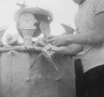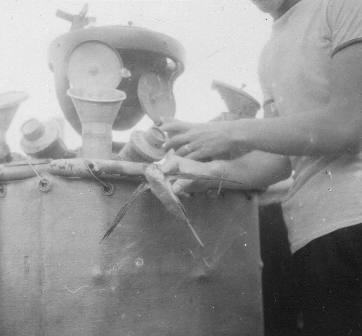 (HST032 - HST033) Flying fish found on bridge of HMCS NEW WESTMINSTER k228 (HST034) St. Pierre Harbour. Carley float of HMCS NEW WESTMINSTER K228 in the foreground Note: Photos HST027 - HST034 are misc. photos dated Jan 1944