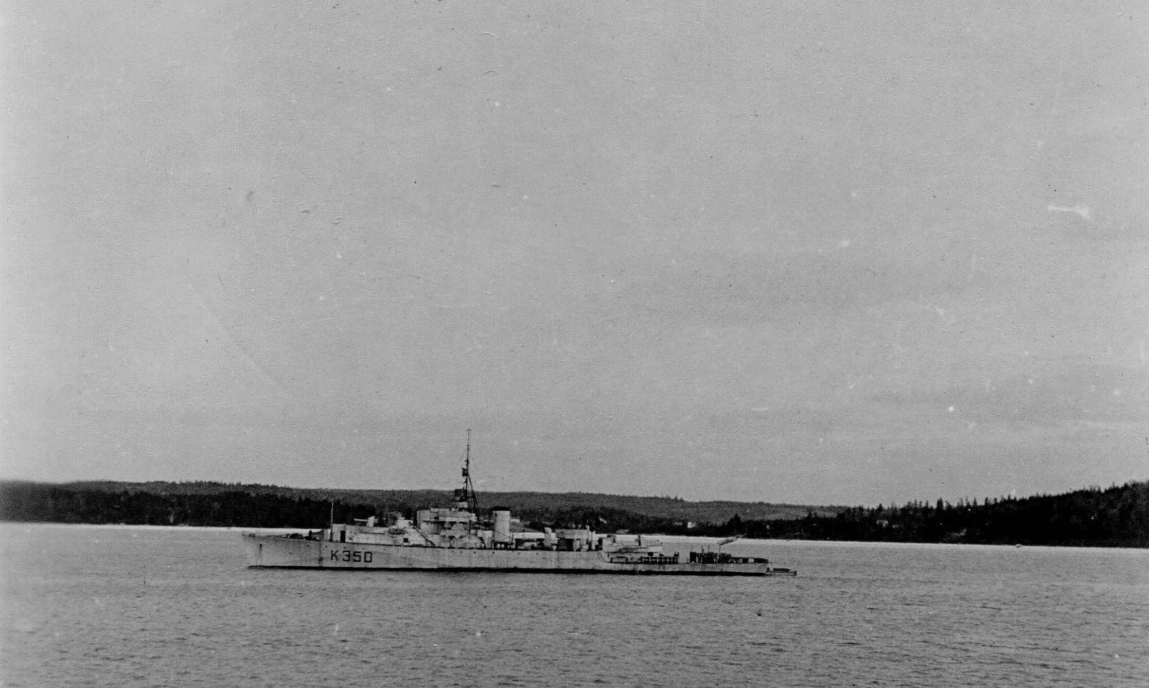 Work Ups (WUPS), St Margaret's Bay, NS - Jan 1944 (HST040 - HST041) HMCS OWEN SOUND K340 (HST043) HMCS NEW WESTMINSTER K340'S whaler under sail with a minesweeper and frigate in background (HST044) Unknown ships at anchor - 2 corvettes and a River Class destroyer