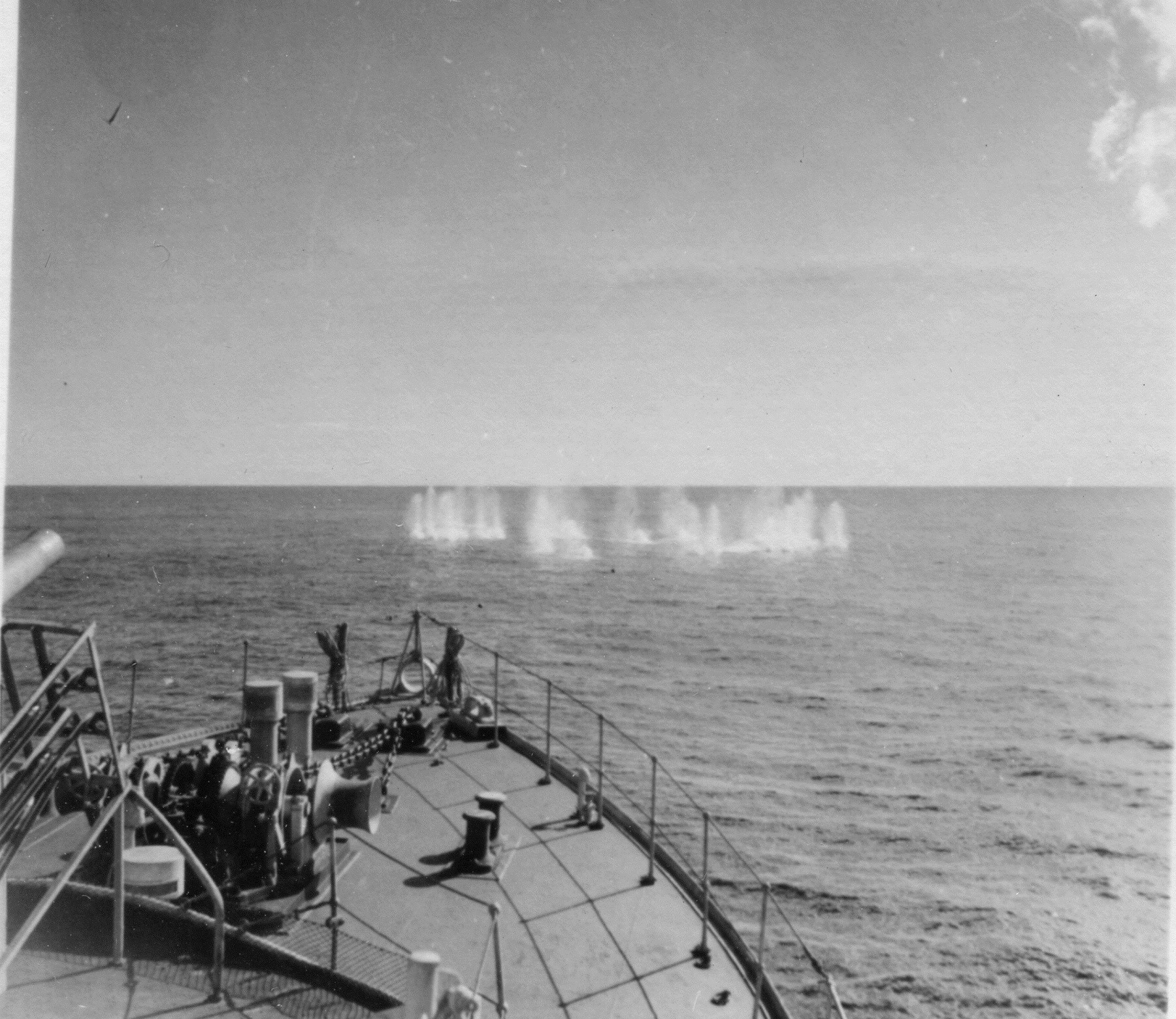 Escort Group C5 (EG.C5) - dated 1944 (HST169 0 HST172) Depth charges dropped by HMCS NEW WESTMINSTER K228 exploding in her wake Webmaster's note: This batch of photos was dated 1944 with no indication of month or convoy. HMCS Hespeler K489 joined EG C5 in Apr 1944 - so the photos are after that point.