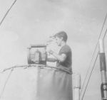 Officers and ratings of HMCS NEW WESTMINSTER K228 - 1944 (HST081) Able Seaman L. Hatch (HST082) N. Paris of Ottawa, ON (HST083) Sig Brown of Montreal, QC (HST084) L/Tel using TBY set (HST085) Unknown Sig on signal lamp