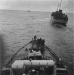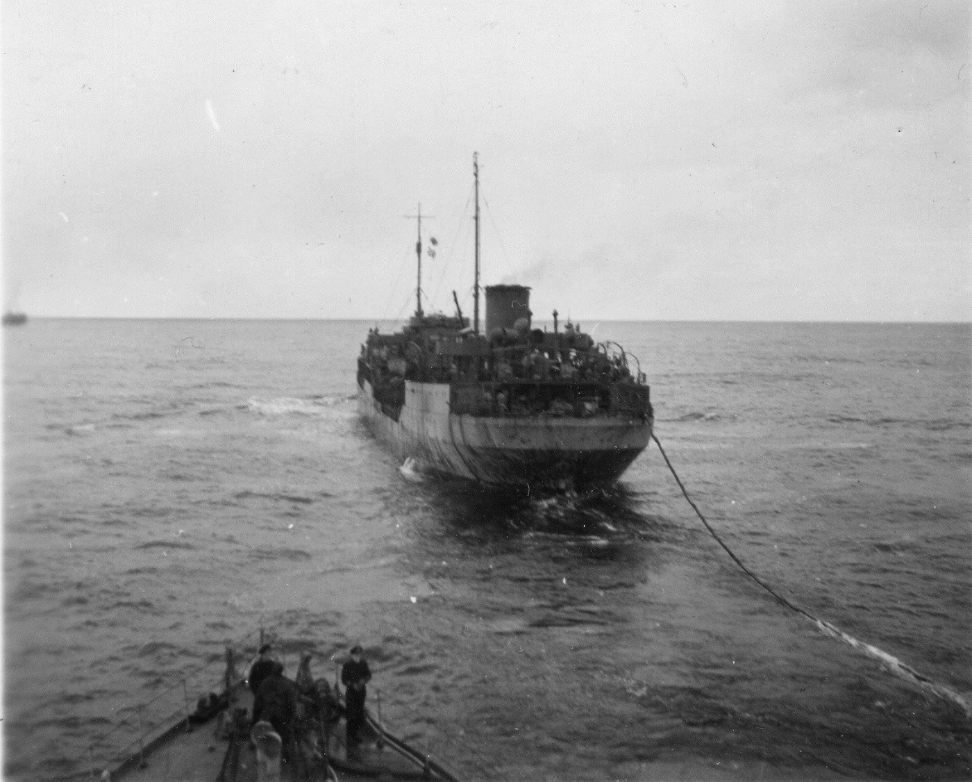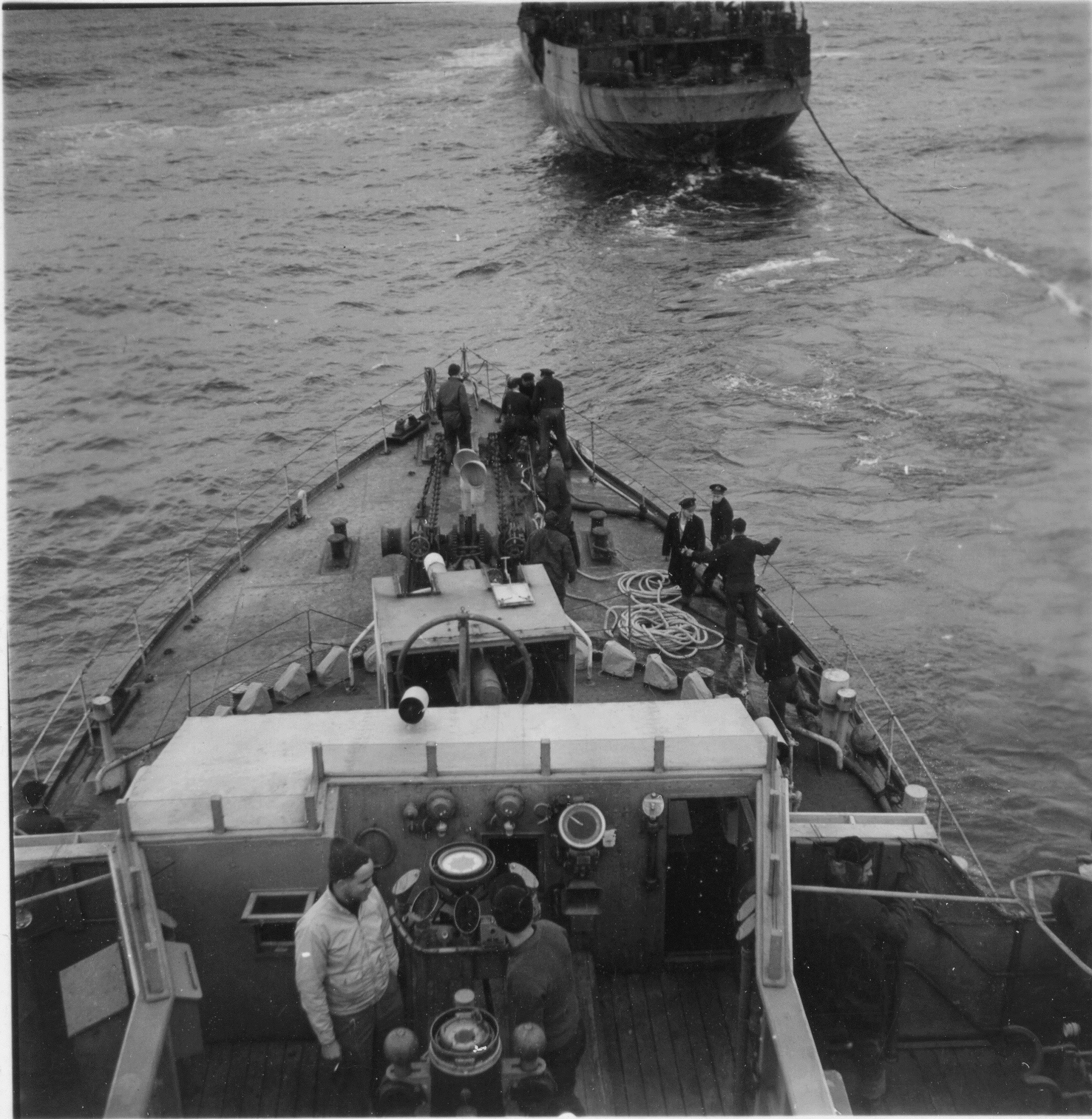 Convoy SC.153 - Halifax to Liverpool - 13 Feb 1944 - 02 Mar 1944 (HST086 - HST090) HMCS NEW WESTMINSTER K228 conducting stern fueling in convoy - Feb 1944