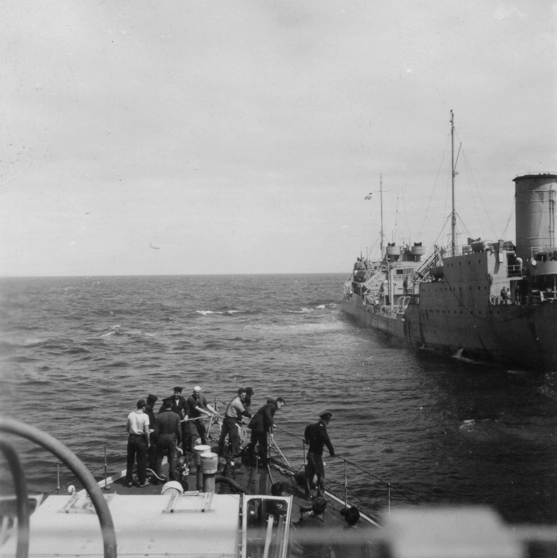 Convoy HX.285 - NYC to Liverpool 28 Mar 1944 - 12 Apr 1944 (HST113 - HST115) HMCS NEW WESTMINSTER fueling from Norwegian oiler Kaia Knudsen